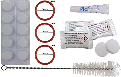 - Inhalt Set: 5x Entkalkungstabletten, á 18g zum Auflösen in Wasser (500ml je Tablette); 10x Spezialreinigungstabletten á 2,5g im Blister mit Faltschachtel und Gebrauchsanweisung; 4g Silikonfett speziell für Kaffeevollautomaten in der wiederverschließbaren Tube; 3x O-Ring 38mm Innendurchmesser, 4mm Dicke, rot; QR-Code-Anleitung zum Richtigen Wechseln der Dichtungen, Entkalken und Reinigen des Gerätes.